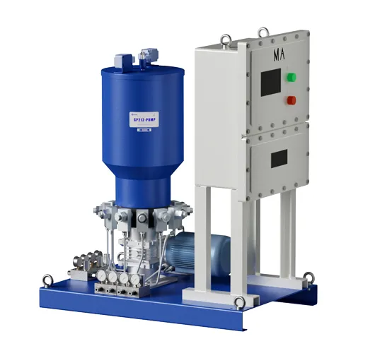 Wielopunktowa pompa smarująca GP-212 wyposażona jest w silnik o dużej mocy, a każda z jej głowic pompy umożliwia prostą i łatwą regulację natężenia przepływu.